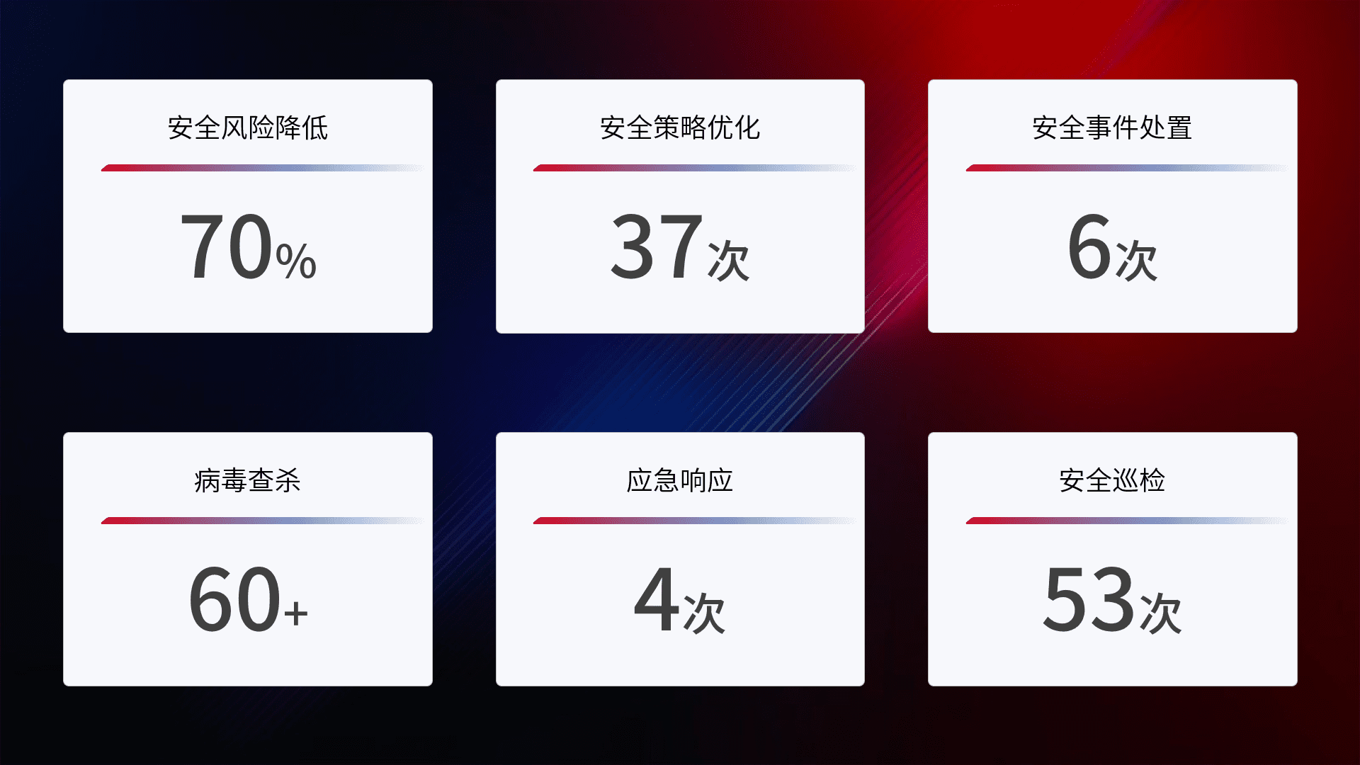 提供全面的安全事件报告体系,,,包括处置报告、、周报、、季度和年度总结,,,,结合持续监控,,,帮助客户深入了解网络安全状况。。