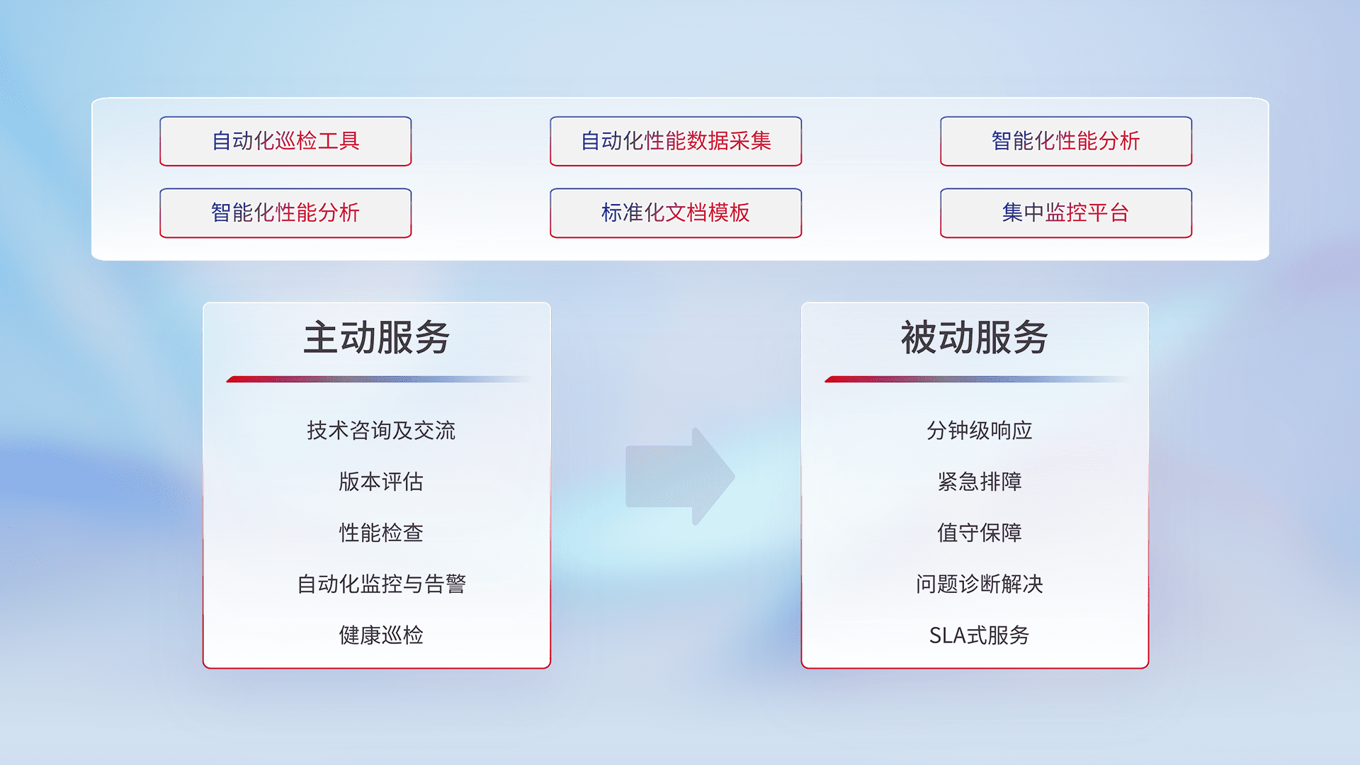 智能化工具和标准化文档,,保障服务质量,,提供主动服务(包含技术咨询、、、版本评估、、、性能检查、、自动化监控与告警、、健康巡检)和被动服务包含(分钟级响应、、、紧急排障、、、值守保障、、问题诊断解决、、SLA服务)。。。
